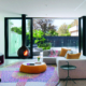 Zentraler, freihängender Kamin mit drehbarem Feuerraum